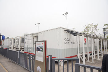 接下來,我們又參觀了華為的集裝箱數(shù)據中心——標準、先鋒、創(chuàng)新機房的代表。集裝箱數(shù)據中心,本來只是因為華為企業(yè)數(shù)據中心機房面積的限制,而企業(yè)又迅速發(fā)展機房容量不夠用,傳統(tǒng)的數(shù)據中心機房建設周期通常在兩年以上,遠不能滿足流媒體等數(shù)據業(yè)務井噴式的發(fā)展需求,集裝箱式的數(shù)據中心解決方案應運而生。華為的集裝箱式數(shù)據中心產品分為兩大類標準產品:一類稱為“All-in-one式集裝箱”,即一個標準集裝箱內集成所有的基礎設施;另一類稱為“集群式集裝箱”,即由不同的箱體形成制冷、供配電、設備安裝等功能模塊,進行靈活組合應用。作為一種新型的建設模式,集裝箱式數(shù)據中心具備如下特點: